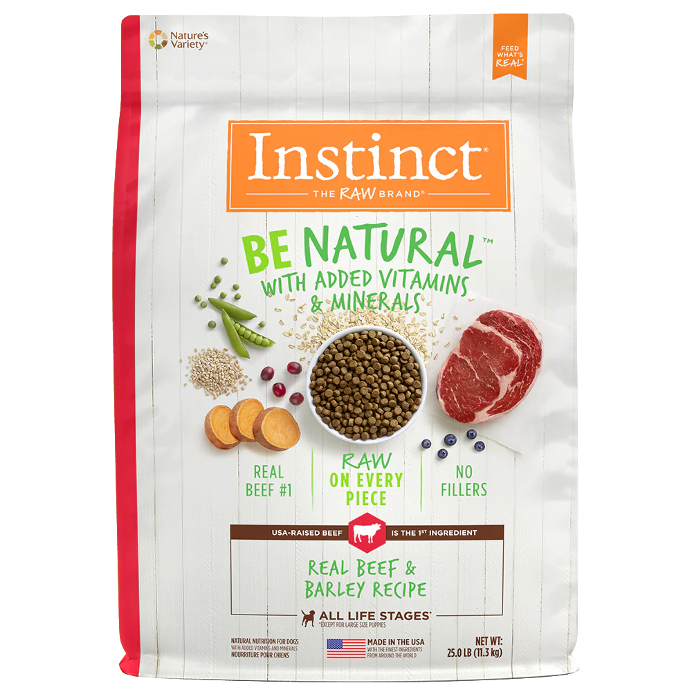 Instinct Be Natural – Res para Perros, La nutrición natural comienza aquí. Instinct® Be Natural ™ Real Beef & Barley Recipe comienza con carne de res criada en EE. UU. Y no contiene harina de relleno, maíz, trigo, soja o subproductos ni conservantes y colores artificiales. Guiados por nuestra creencia en el poder de la materia prima, cada pieza se revuelve con carne de res cruda liofilizada triturada, elevando la barra en nutrición y sabor.